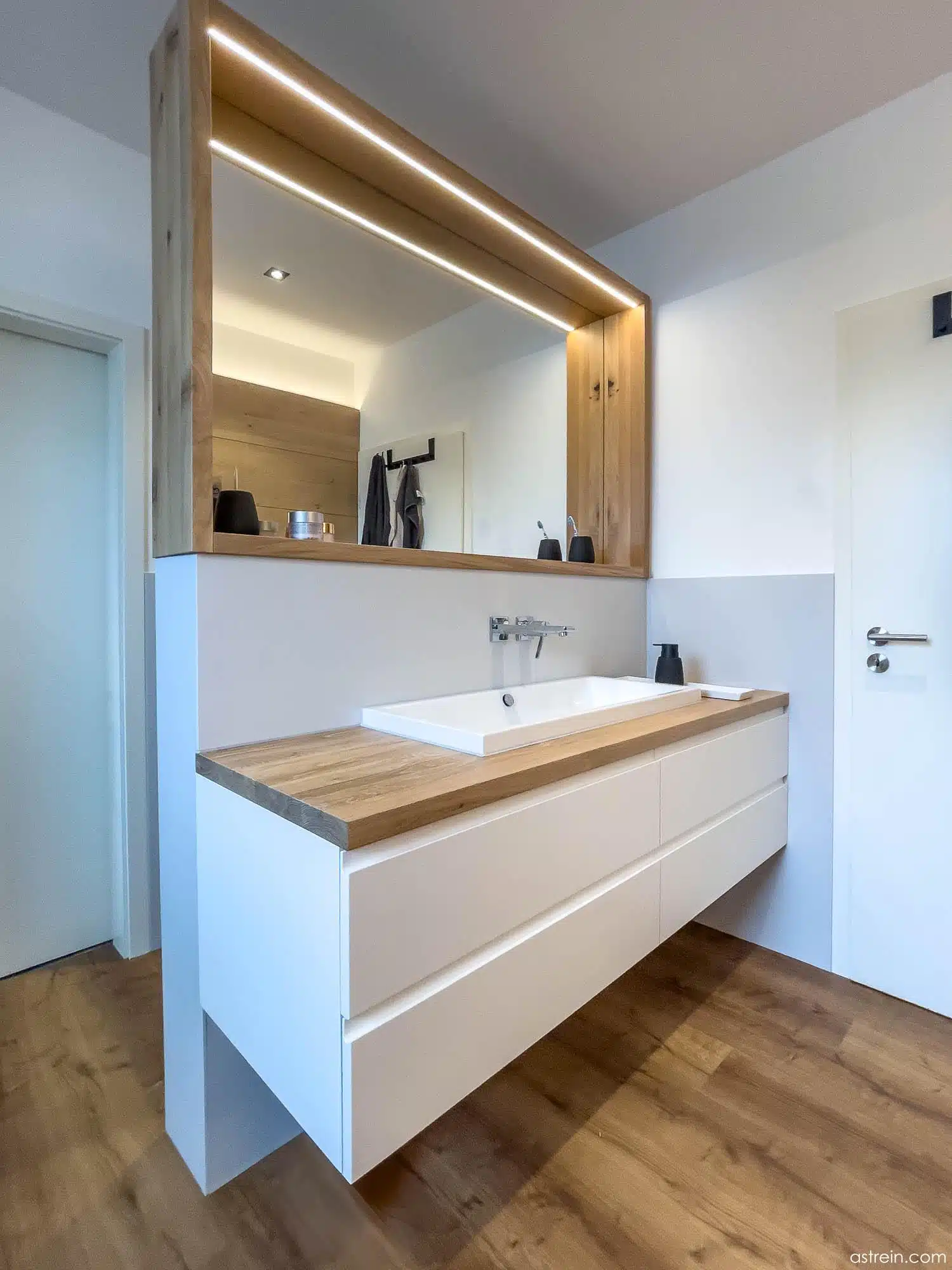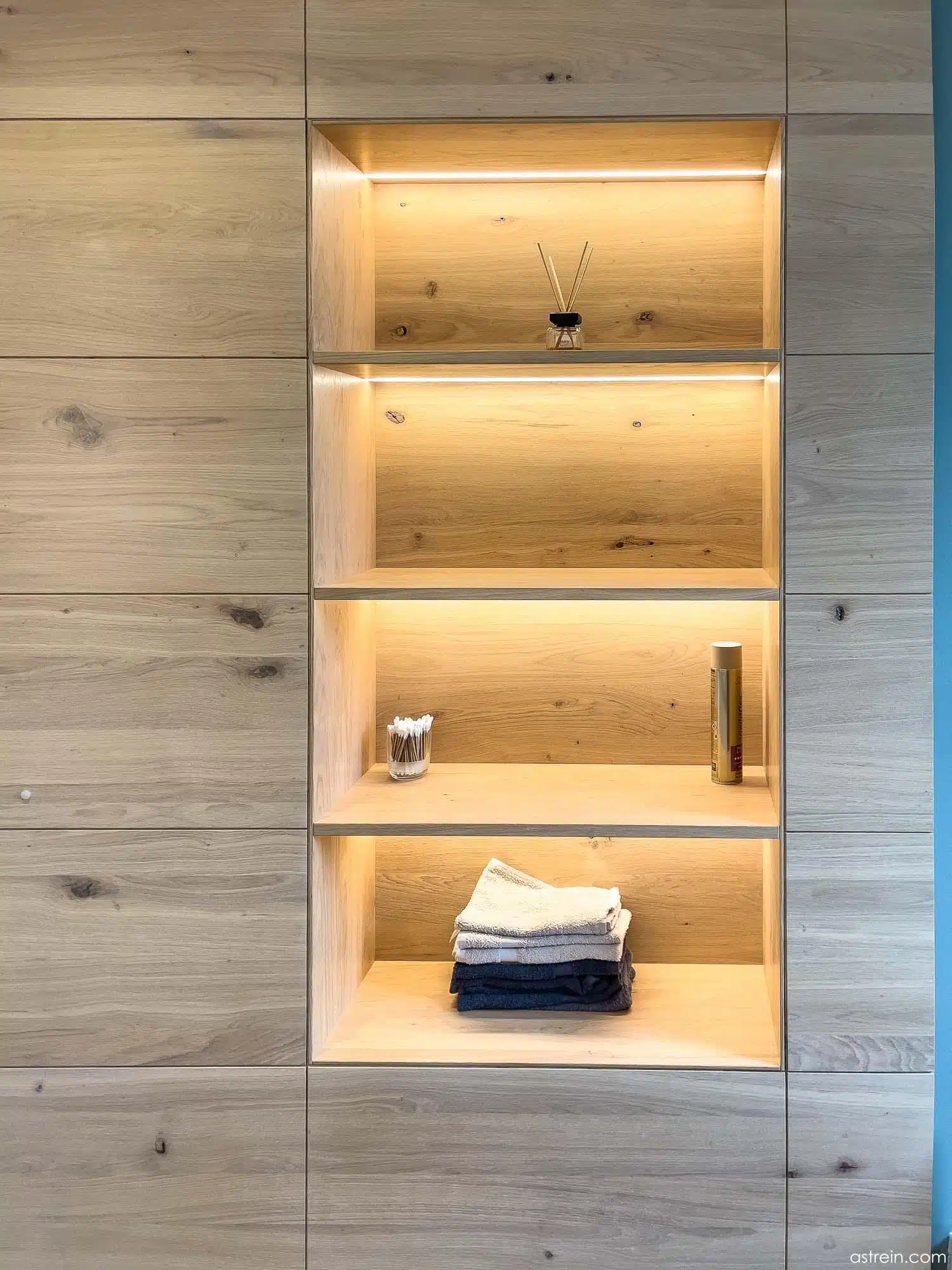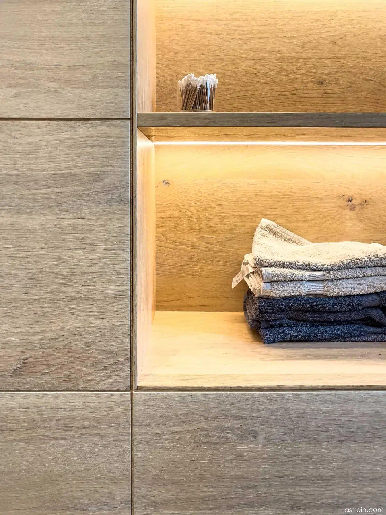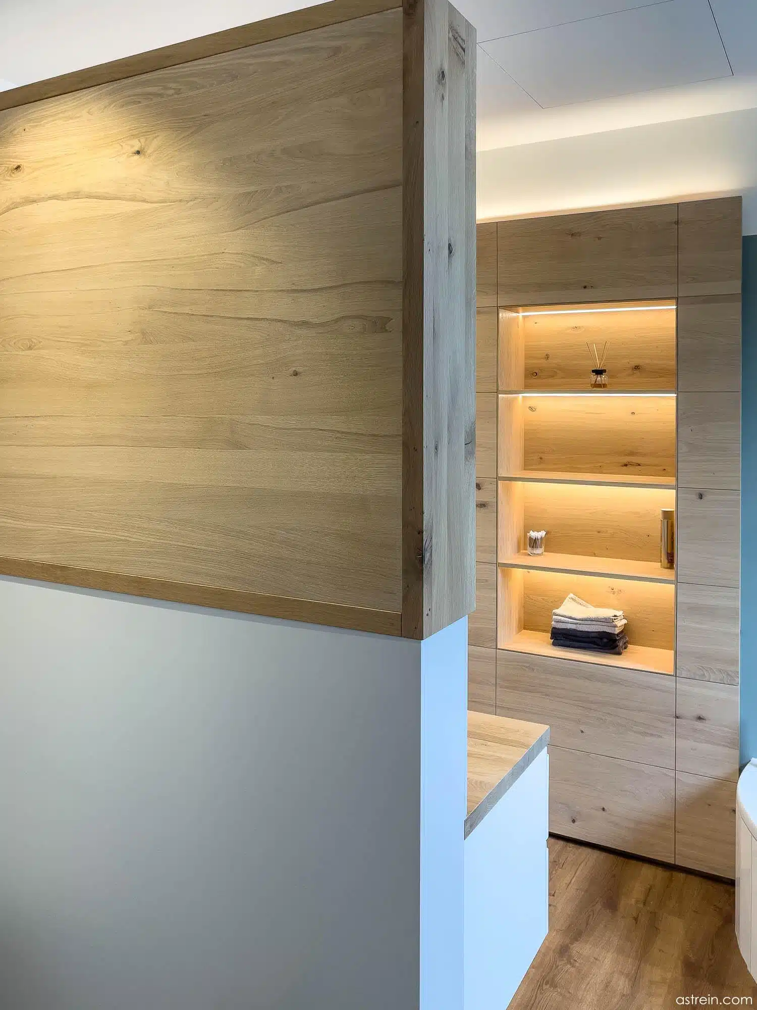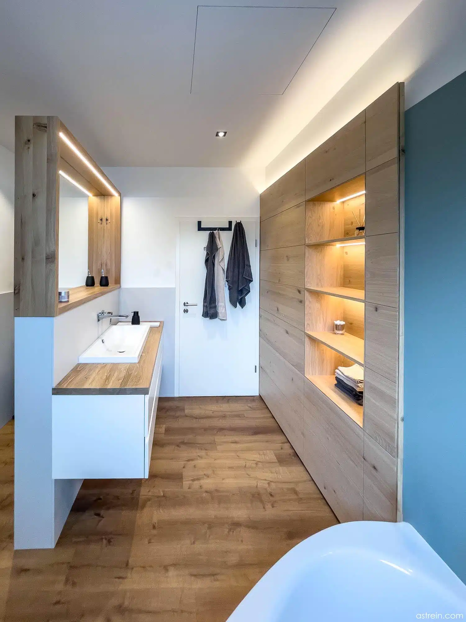 Wandverkleidung und flächenbündig eingesetztes Regal mit integrierter Beleuchtung und Hinterleuchtung aus Eiche Massivholz, geölt. Gegenüber befindet sich ein Waschtisch mit eingefrästen Griffprofilen in den lackierten Schubkastenfronten, mit Aufsatzwaschbecken auf einer massiven, geölten Eicheplatte.