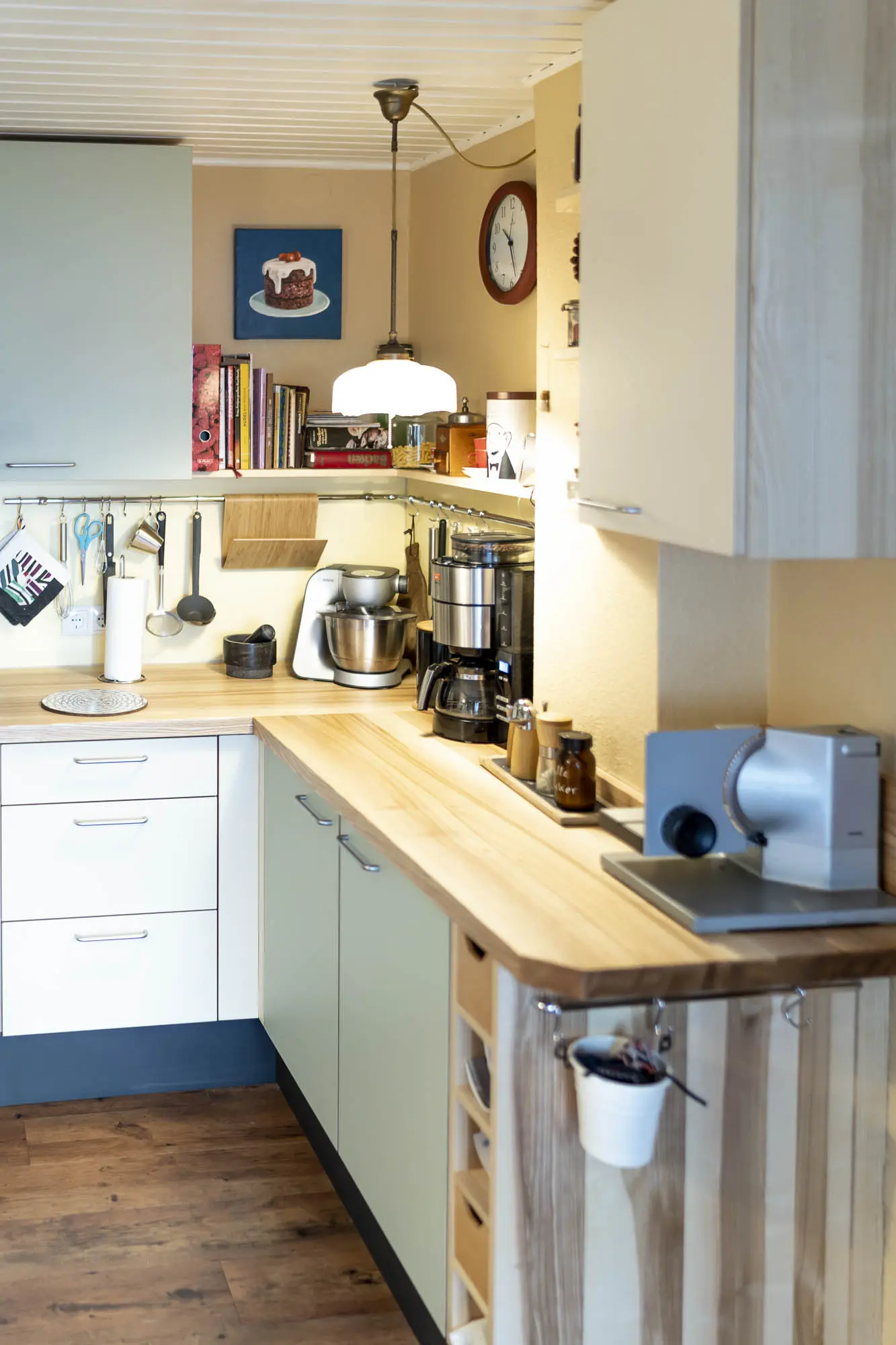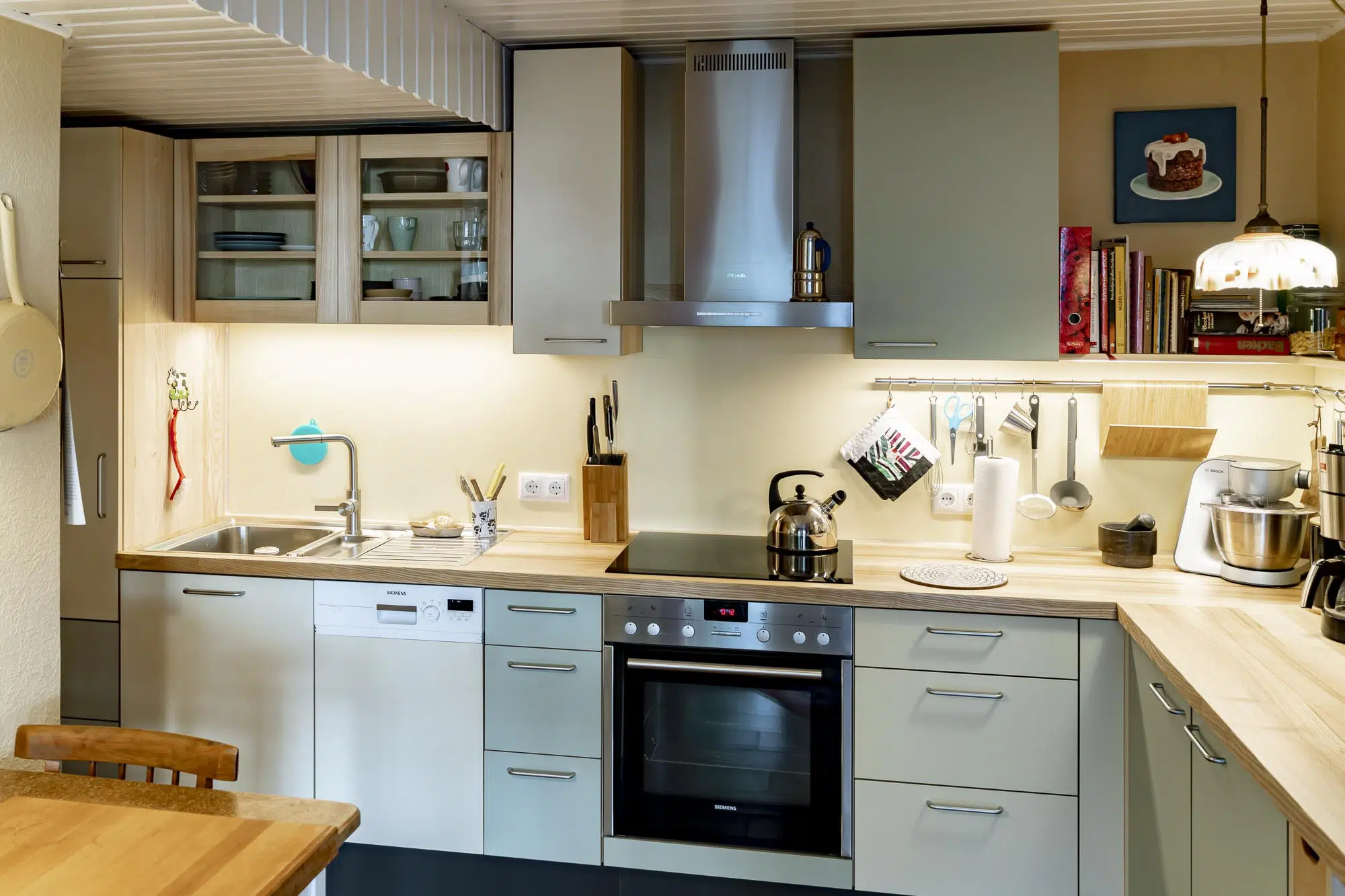 Die Küche aus geöltem Kern-Escheholz mit weiß lasierten Multiplexfronten lässt den relativ kleinen Raum hell und warm wirken.