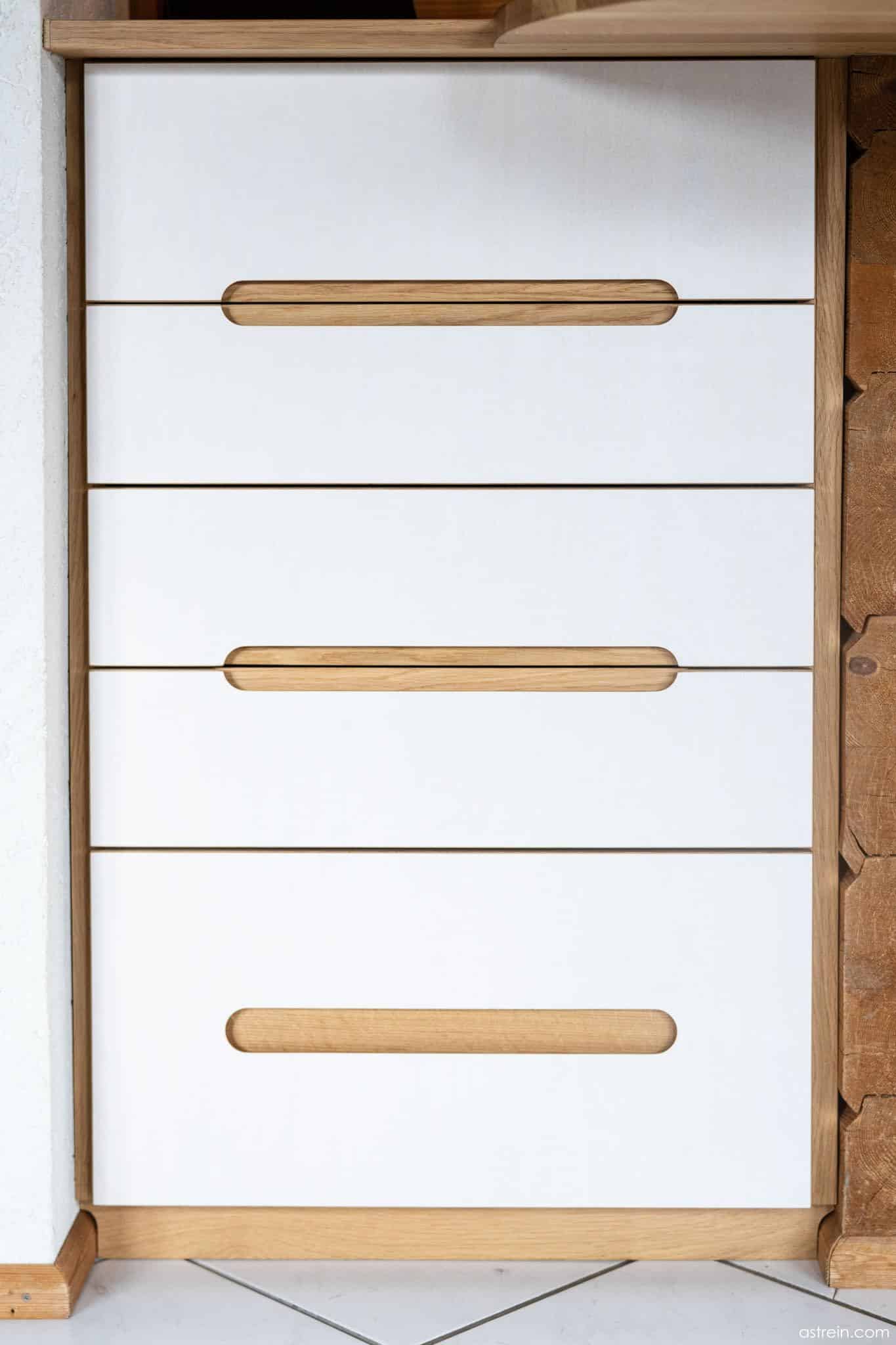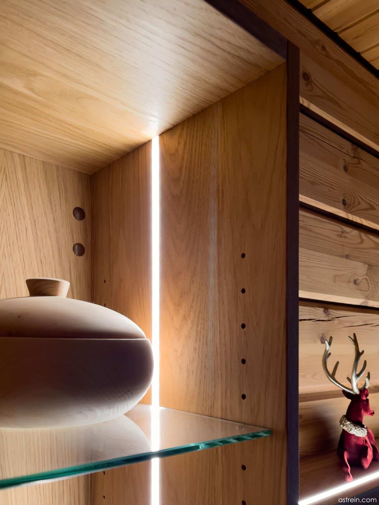 Im Blockhaus haben wir mit Eiche Massivholz und Fronten aus weiß lasiertem Multiplex einen Übergang zwischen Wand und Fliesenboden geschaffen. Drei Sideboards, ein Vitrinen-Schrank, mehrere Boarde und viel Beleuchtung. Schöne Details sind die mit Eiche hinterlegten Griffausfräsungen, die Kabelführungen und -durchlässe sowie die individuell einstellbare, atmosphärische Beleuchtung.